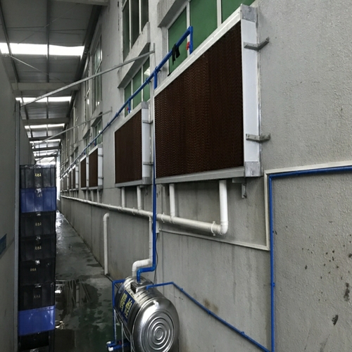 車間外墻上安裝環保空調,它是通過風機往車間內送風,室外的新鮮空氣流經浸水的濕簾后空氣與水份充分接觸同時吸收空氣重點中的顯熱,從而達到降溫、換氣、除塵、增加車間內空氣含氧量的目的,這個方案特別適用于高溫及人群密集場所。